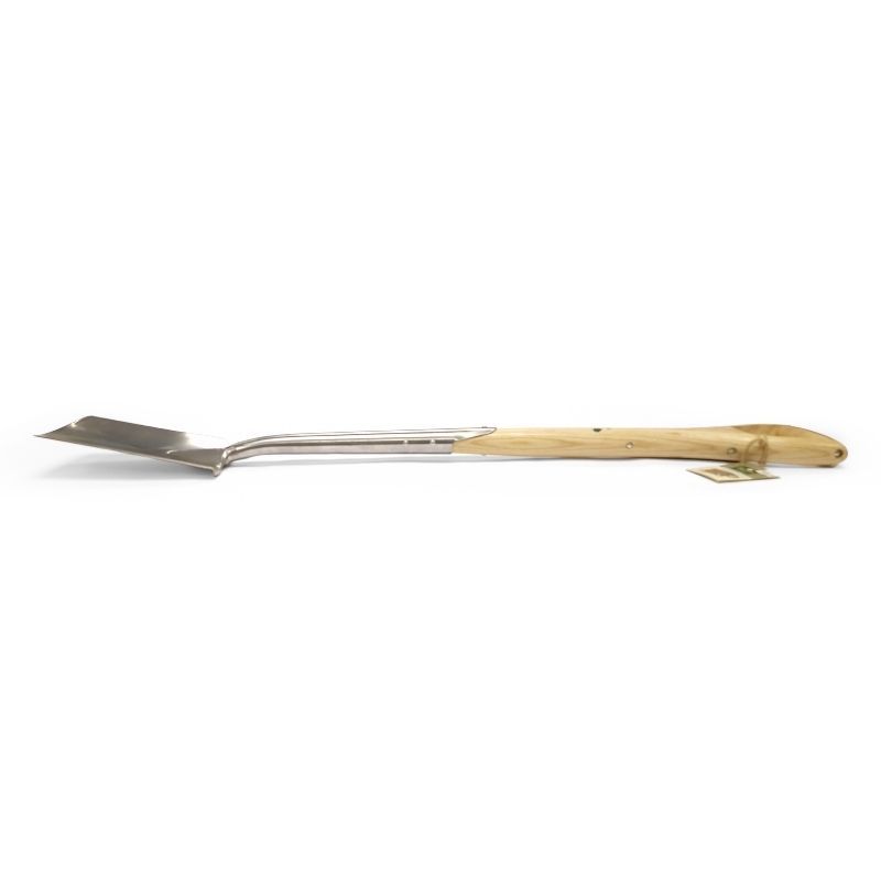 The blade is intentionally narrower than a standard digging spade, allowing you to work between plants and in tighter border areas with minimal disturbance to roots. Its high-carbon stainless steel composition is mirror-polished, giving it a sleek finish that resists soil sticking and ensures smooth penetration into the ground.