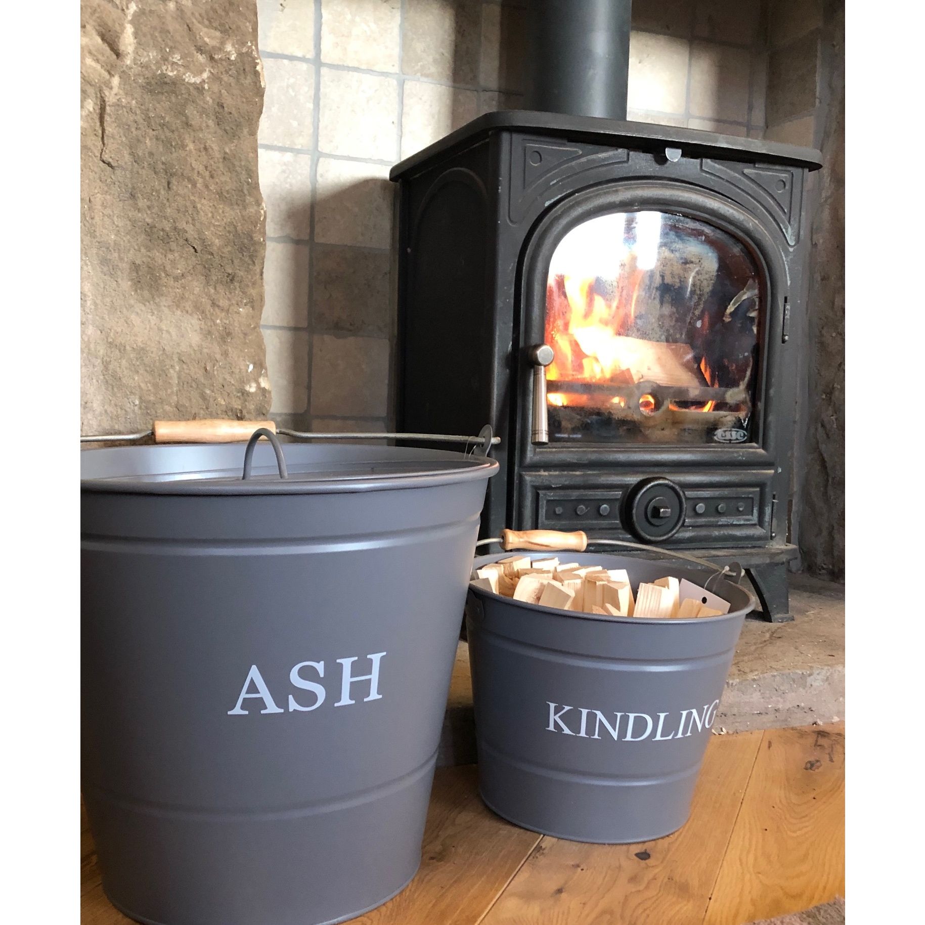 Crafted in Powder Coated Steel and finished in a choice of Grey or cream, the 'KINDLING' graphic has been printed on one side. Finished with the central ridged detailing this gives a simple yet effective design element to sit proudly next to your fireside or log burner.
