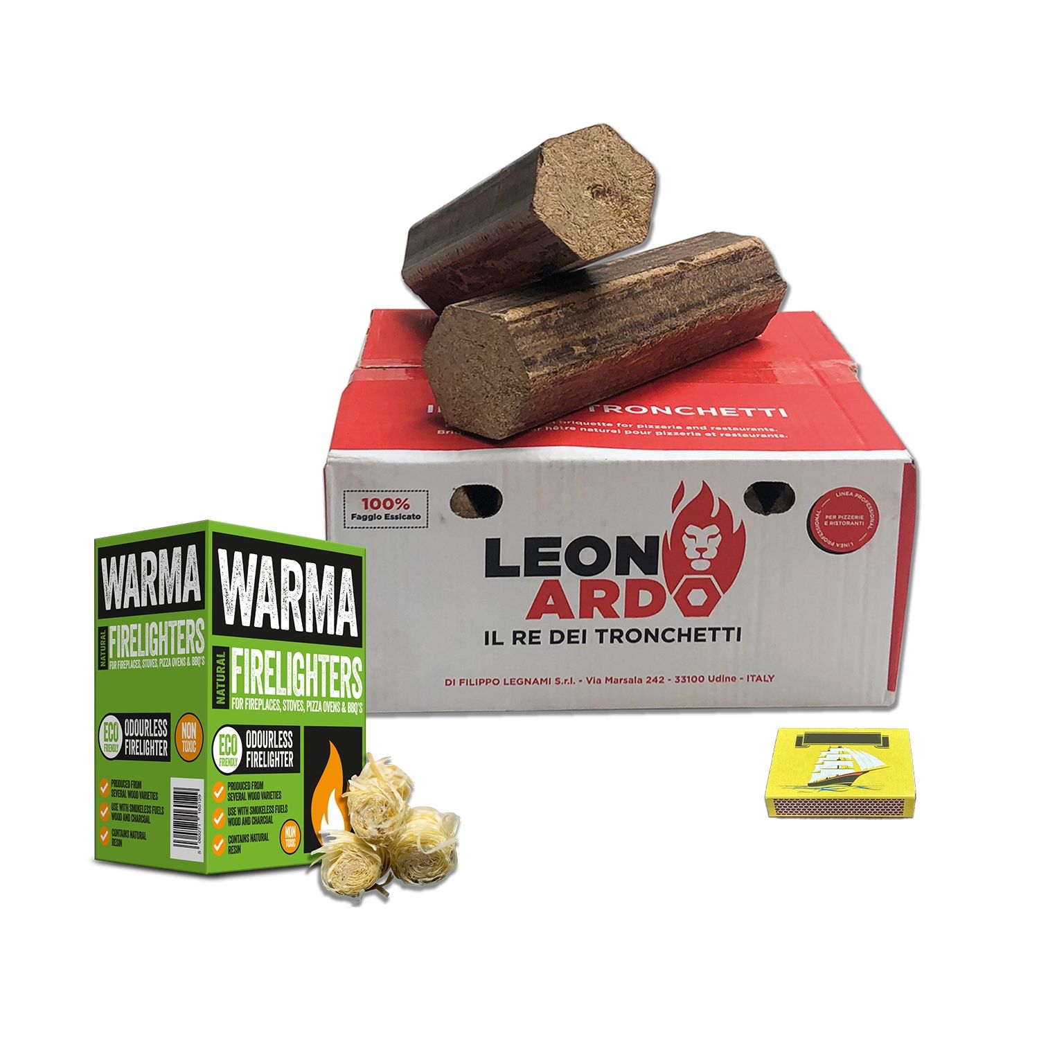 Leonardo Pizza Briquettes Bundle - 1 x box of Leonardo Pizza Briquettes, 1 x Box of Eco Wood Wool Firelighters & small pack of matches.