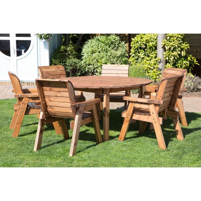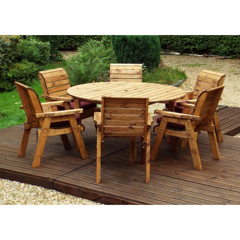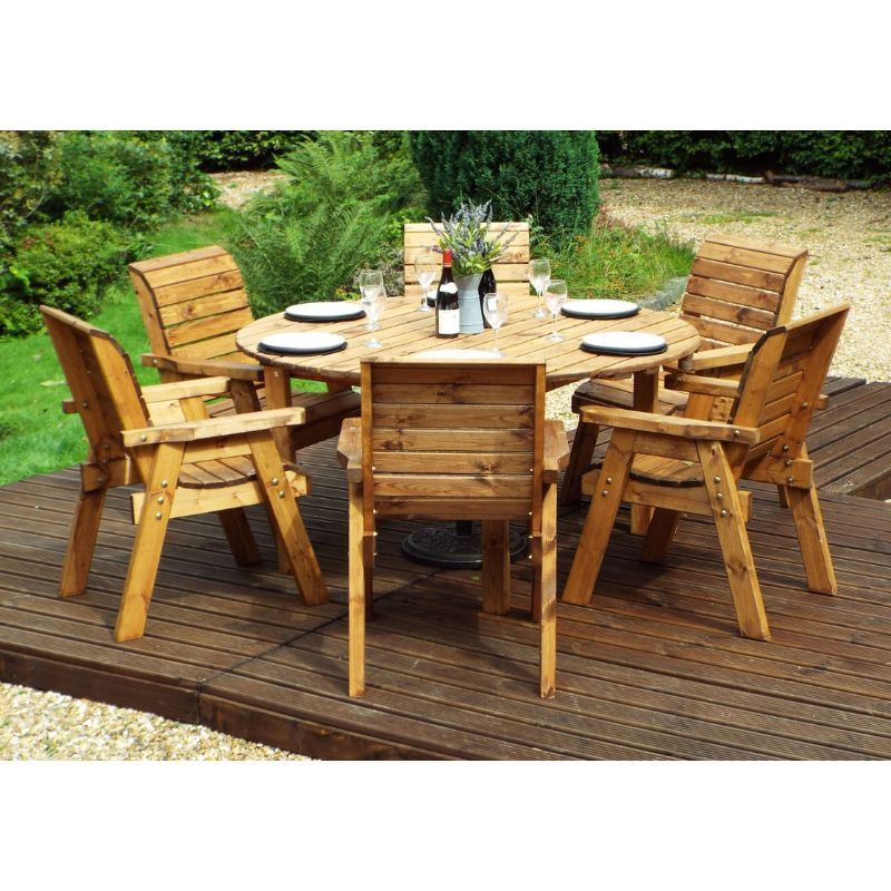 • Complete outdoor dining set – includes six traditional garden chairs and a large circular table, creating the perfect wooden garden furniture centrepiece.